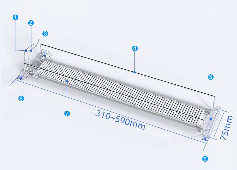 Adjustable 310–590 mm length and 75 mm track width. Transparent components simplify inspection and cleaning for store operators.